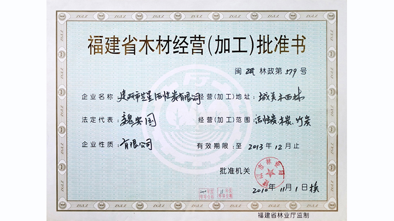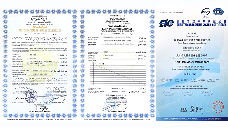 公司已取得《全国工业产品生产许可证》、《涉及饮用水卫生安全产品卫生许可批件》、《排放污染物许可证》、《药用活性炭生产许可证》、犹太洁食认证(KOSHER CERTIFICATE)、伊斯兰教清真认证(HALA)《中华人民共和国海关进出口货物收发货人报关注册登记证》等生产性、经营性准入认证,拥有自主进出口经营权。通过了国际《质量管理体系》-ISO 9001:2008、《环境管理体系》-ISO 14001:2004和《职业健康安全管理体系》-OHSAA 18001:2007的认证。